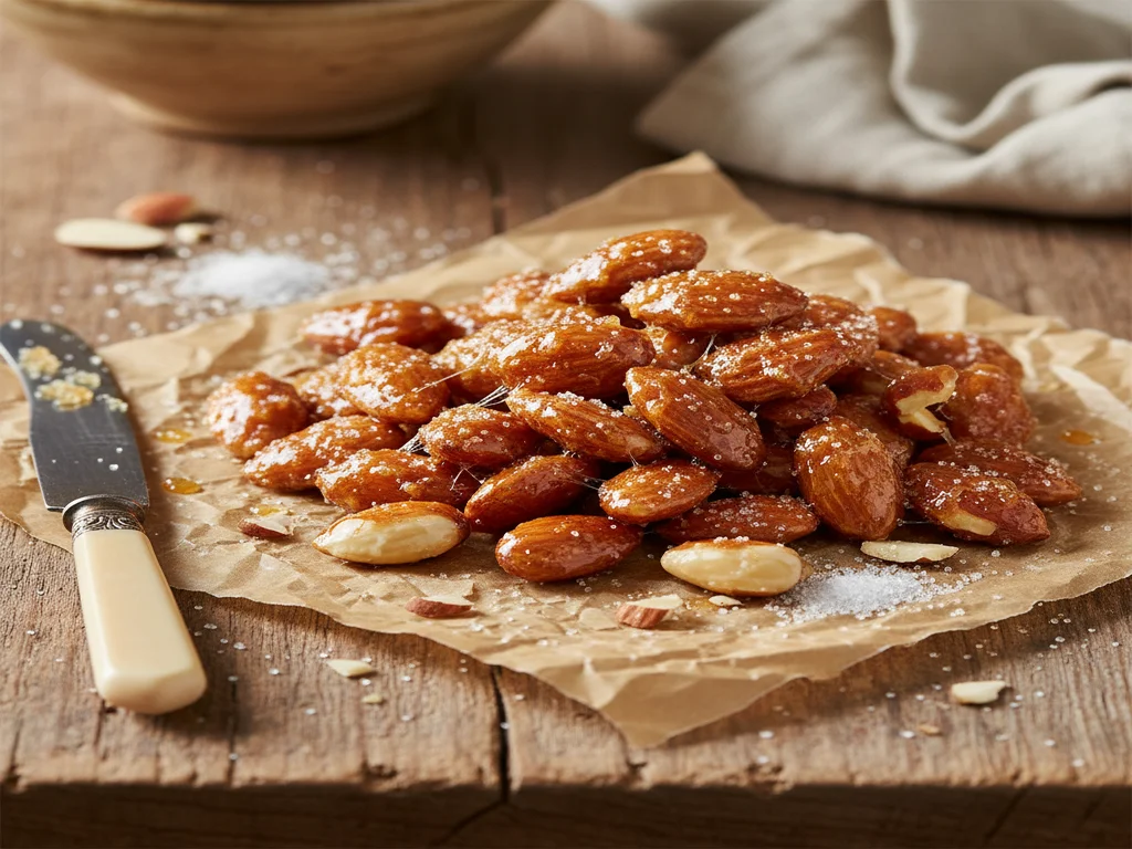 - Słodkie migdały w karmelu podawać jako przekąskę.