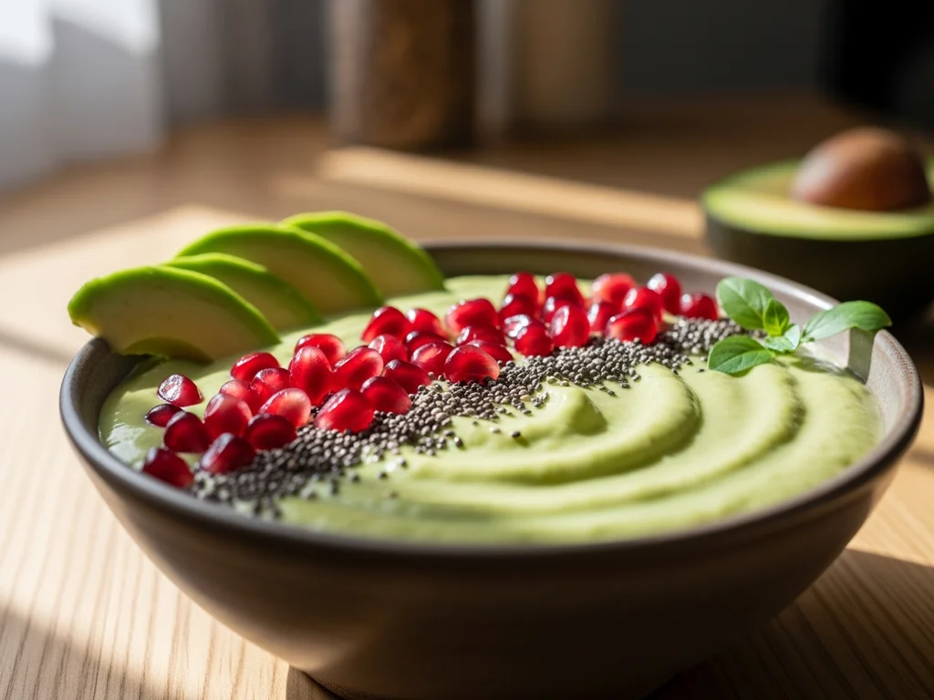 - Smoothie bowl z awokado i pestkami granatu polać syropem z agawy, udekorować pestkami granatu, borówkami, pestkami dyni, płatkami kokosa i nasionami chia, podawać bezpośrednio po przygotowaniu.