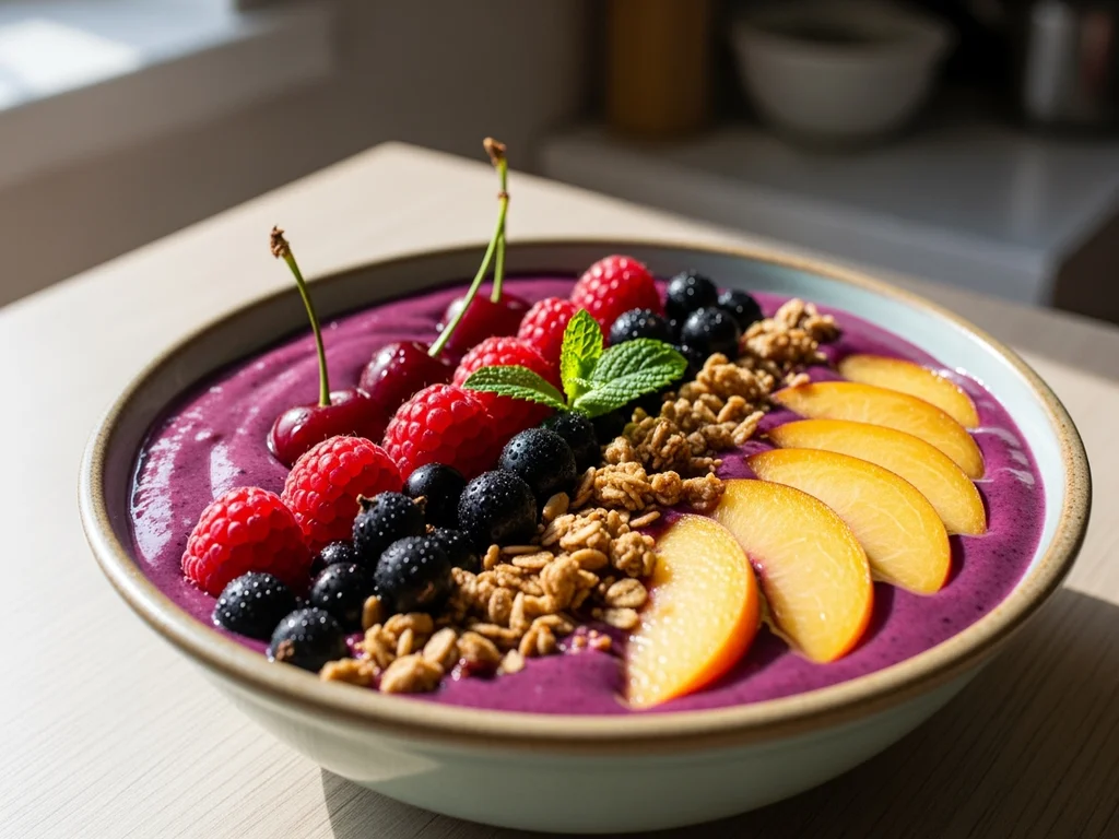- Do naczynia miksującego włożyć owoce, jogurt, masło orzechowe i miód, zmiksować15-30 s/obr. 10. Smoothie bowl z owoców z kompotu podawać udekorowane owocami jagodowymi i migdałami.
