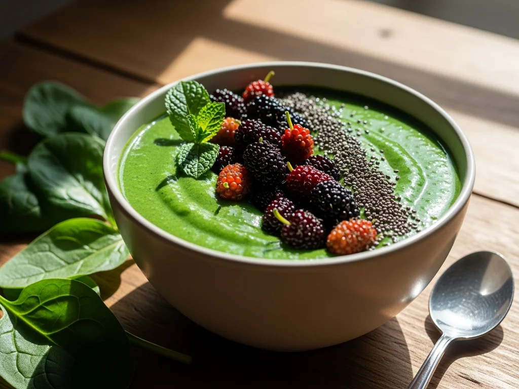 - Do naczynia miksującego dodać banany, szpinak, ananas, otręby owsiane, syrop klonowy i lód, zmiksować1 min/obr. 10. Przełożyć do misek. Smoothie bowl ze szpinakiem i morwą udekorować figami, ananasem, morwą i rozdrobnionymi nerkowcami, podawać bezpośrednio po przygotowaniu.