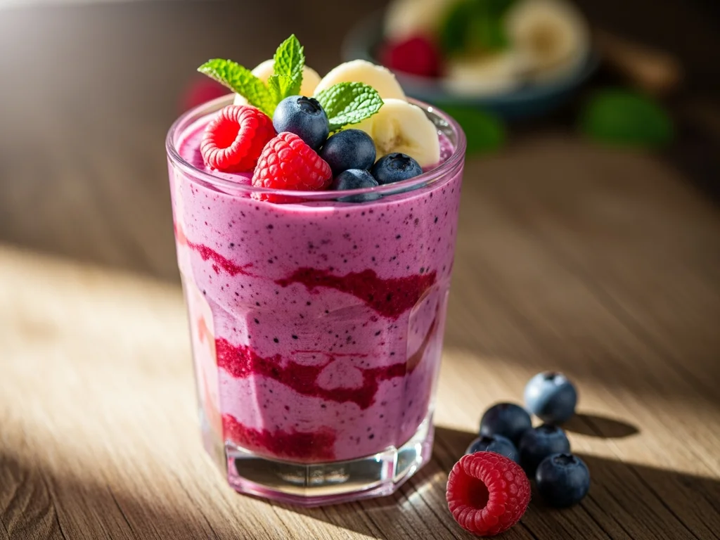 3. Dodać nasiona chia, wymieszać30 s/obr. 3. Smoothie malina-borówka-banan podawać bezpośrednio po przygotowaniu.