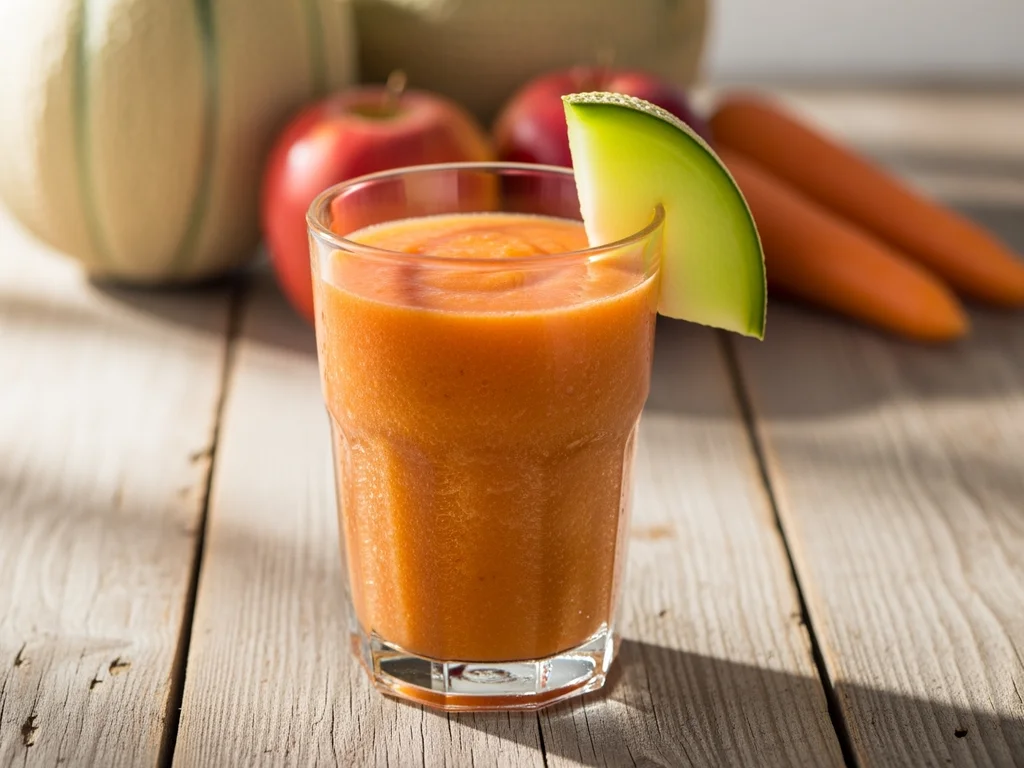 1. Do naczynia miksującego włożyć pomarańczę, melona, marchewkę i jabłka, dodać sok z limonki, zmiksować10 s/obr. 10. Składniki zgarnąć kopystką ze ścianek na dno naczynia miksującego.