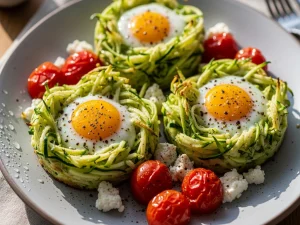 - Na kuchence, na dużej patelni rozgrzać olej. Masę warzywną ponownie przemieszać kopystką. Na patelnię nakładać po 2 łyżki masy warzywnej, formując 6 okrągłych gniazdek z otworem w środku. Smażyć 1-2 min, następnie ostrożnie obrócić za pomocą łopatki. W środku każdego gniazdka umieścić po 1 żółtku, następnie oprószyć je solą i pieprzem. Smażyć kolejne 1-2 min lub do uzyskania złotobrązowego koloru. W zależności od preferencji, gniazdka można ponownie obrócić i smażyć kolejne 30 s, aby usmażyć żółtka z obu stron. Śniadaniowe gniazdka z cukinii podawać z dodatkiem ziołowej śmietany i pieczywa.
