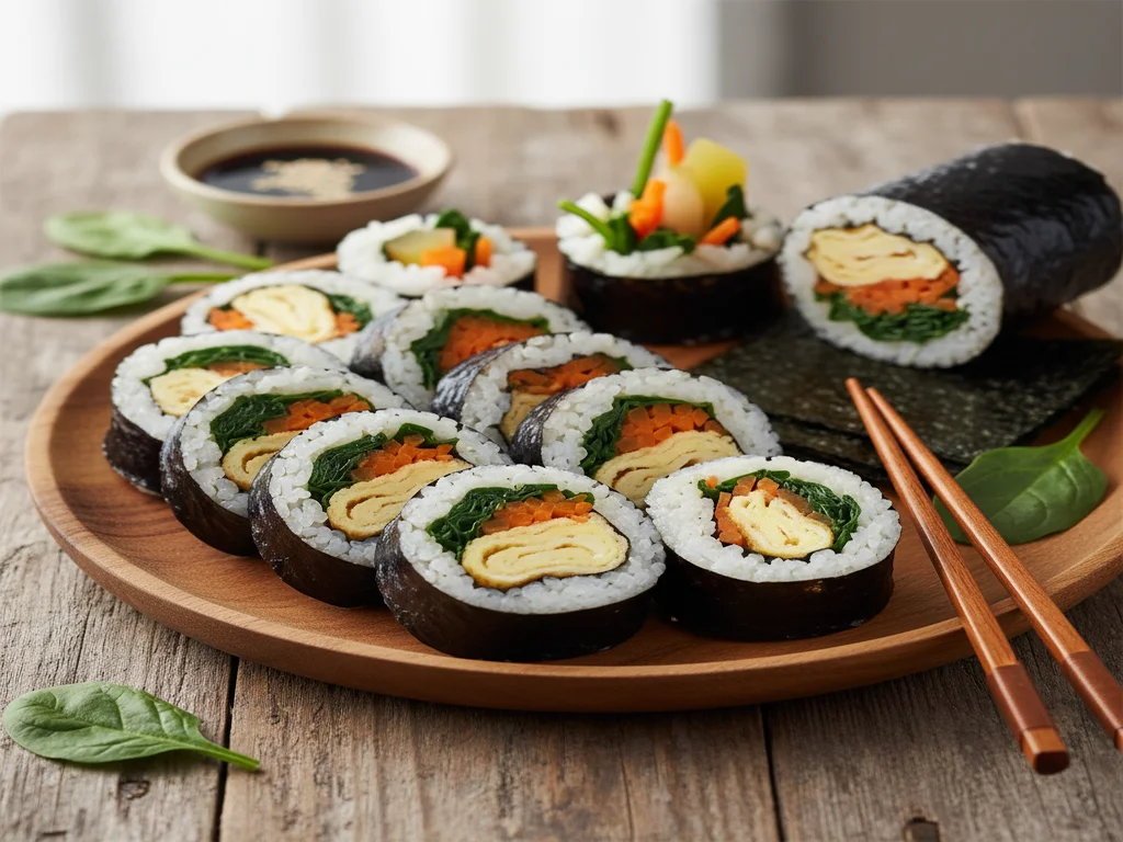 - Na macie do sushi umieścić pierwszy płat nori. Ugotowany ryż podzielić zwilżonymi dłońmi na 5 równych części. 1 część ryżu rozprowadzić na nori, zostawiając 2 cm margines. Na ryżu ułożyć równolegle do siebie pasy z 1/5 marchewki, 1/5 ogórka, 1/5 kapusty, 1/5 zielonej cebulki, 1-2 łyżek kimchi, 1/5 ostudzonego szpinaku i 2 paski omletu. Ciasno zwinąć. Powtórzyć czynności dla pozostałych składników. Wegetariański kimbap z omletem i szpinakiem pokroić w 2-3 cm plastry, posypać sezamem i podawać bezpośrednio po przygotowaniu lub zapakować w formie lunchboxu (patrz wskazówka).