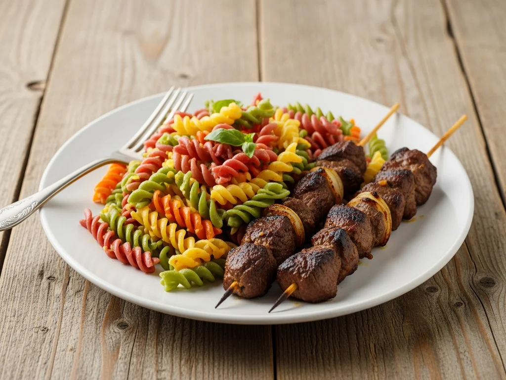 - Do naczynia miksującego dodać pozostałe 1½ łyżeczki soli i makaron, gotować zgodnie z czasem podanym na opakowaniu100°C//obr. 1. Ugotowany makaron odsączyć przez dolną część przystawki Varoma, polać 1 łyżką oleju i wymieszać, aby zapobiec sklejeniu. Makaron przełożyć na 4 talerze, ułożyć na nim krojone i starte warzywa, polać odłożonym sosem orzechowym, posypać sezamem i kolendrą. Wołowe sataye podawać z kolorowym makaronem bezpośrednio po przygotowaniu.