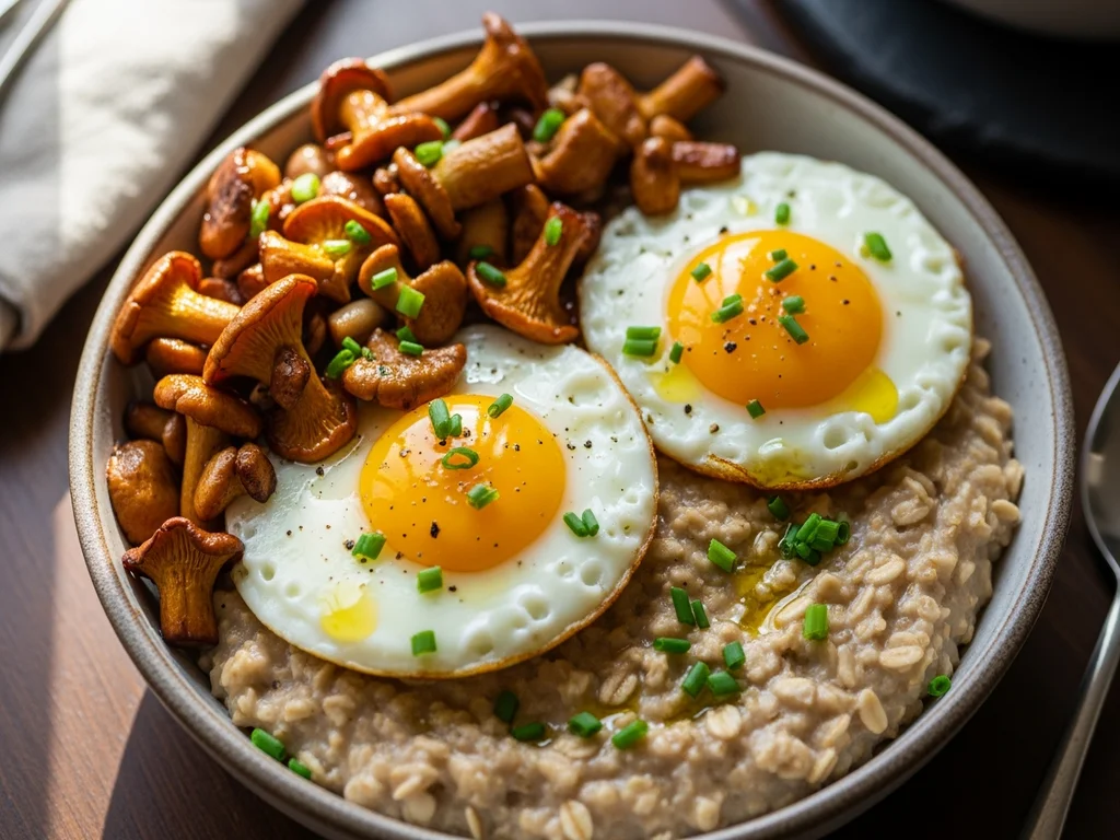 Wytrawna owsianka z jajkami i zrumienionymi pieczarkami