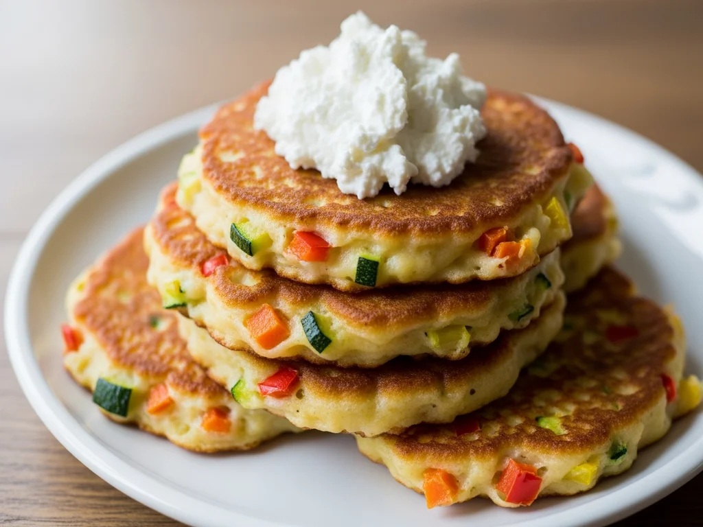 - Na kuchence, na nieprzywierającej patelni rozgrzać masło klarowane. Łyżką nabierać porcje ciasta i nakładać na rozgrzaną patelnię, formując racuchy (Ø 7-8 cm), smażyć partiami 3-4 min z każdej strony lub do uzyskania złotobrązowego koloru. Usmażone racuchy odkładać na talerz wyłożony papierowym ręcznikiem, aby odsączyć z nadmiaru tłuszczu. Wytrawne racuchy z warzywami podawać bezpośrednio po przygotowaniu, np. z dodatkiem sosu tzatziki lub crème fraîche (patrz wskazówka).