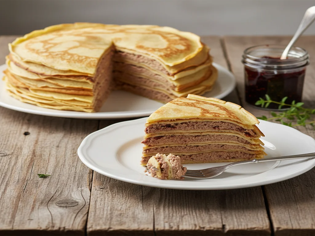 - Na talerzu położyć naleśnik, równomiernie posmarować go 1-2 łyżkami nadzienia, przykryć kolejnym naleśnikiem. W ten sposób przełożyć wszystkie naleśniki. Ostatni naleśnik posmarować majonezem. Wytrawny tort naleśnikowy z wątróbką udekorować rozdrobnionym koperkiem i odważoną papryką, podawać bezpośrednio po przygotowaniu.