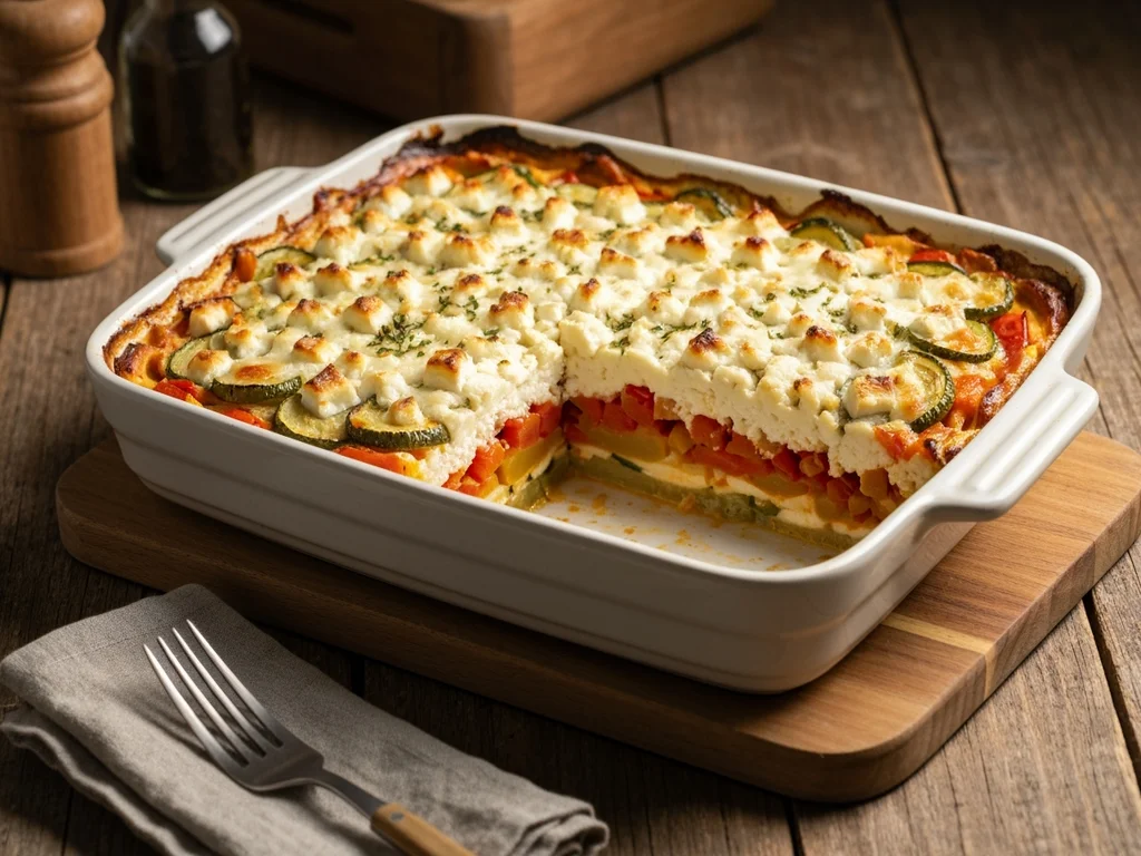 - Na pokrywie naczynia miksującego postawić miskę, odważyć do niej szpinak, odstawić. Na pokrywie naczynia miksującego postawić drugą miskę, odważyć do niej ser feta, odstawić. Zapiekankę warzywną posypać odważonymi liśćmi szpinaku i serem feta. Zapiekankę warzywną z serem feta podawać bezpośrednio po przygotowaniu, z dodatkiem dressingu cytrynowego z chili.