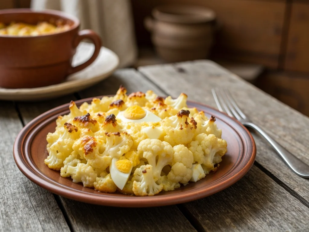 - Ułożyć ugotowany na parze kalafior i ćwiartki jajek w naczyniu żaroodpornym, polać sosem i posypać pozostałym rozdrobnionym serem, piec ok. 10 min (200°C, funkcja grill) lub do momentu, aż nabierze złotobrązowego koloru. Zapiekankę z kalafiora i jajek podawać bezpośrednio po przygotowaniu.