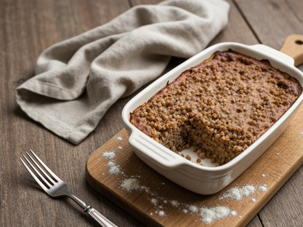- Piec 30 min (200°C). Po tym czasie ostrożnie zdjąć folię i zmniejszyć temp. do 190°C, piec kolejne 15-25 min. Upieczoną zapiekankę odstawić na ok. 15 min. Zapiekankę z kaszy gryczanej podawać jako danie główne.