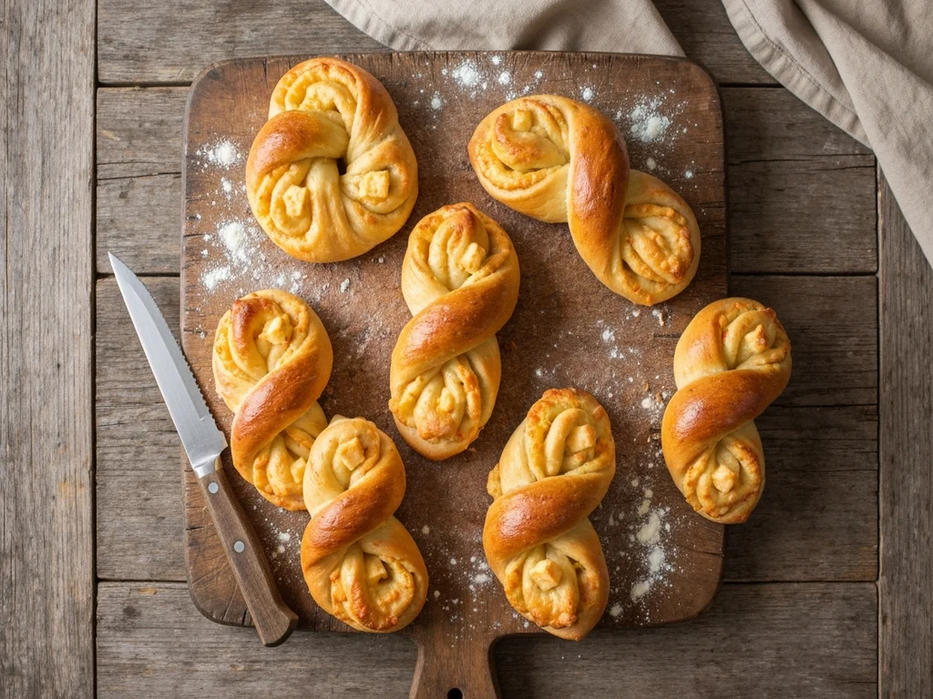- Wyrośnięte ciasto przełożyć na oprószony mąką blat, rozwałkować na prostokąt (35 x 60 cm). Na cieście rozsmarować masę serową, pozostawiając wzdłuż obu dłuższych boków ok. 5 cm margines. Boki z marginesem założyć do środka tak, aby lekko nachodziły na siebie. Skleić wszystkie krawędzie i ostrożnie obrócić ciasto tak, aby łączenie znalazło się na dole. Ostrym nożem pokroić ciasto na 10 pasów (szer. ok. 6 cm). Każdy pas ciasta skręcić dwukrotnie i ułożyć na przygotowanych wcześniej blachach. Odstawić do wyrośnięcia na ok. 10 min. W tym czasie rozgrzać piekarnik do temp. 180°C.