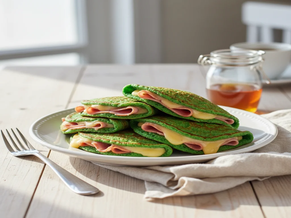 5. Do naczynia miksującego dodać szynkę i pieprz, rozdrobnić10 s/obr. 4. Nadzienie nałożyć na naleśniki (ok. 2 łyżki na szt.). Naleśniki zwinąć, ułożyć na przygotowanej blasze i posypać rozdrobnionym serem. Piec ok. 15 min (180°C), do momentu, aż ser się roztopi, a brzegi naleśników się zrumienią. Zielone naleśniki z szynką i serem podawać bezpośrednio po przygotowaniu.