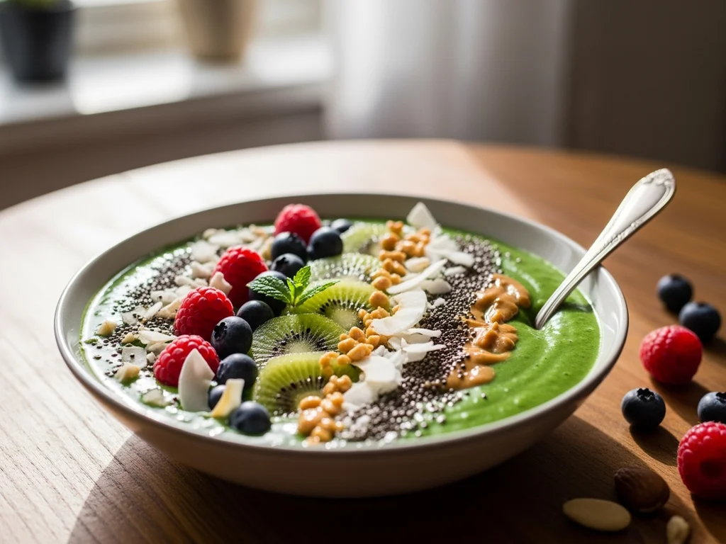 - Do naczynia miksującego włożyć szpinak i banan, dodać jogurt, lód, masło orzechowe, sok z limonki i miód, zmiksować1 min/obr. 10. Zielone smoothie bowl podawać bezpośrednio po przygotowaniu udekorowane świeżymi owocami, ziarnami słonecznika i wiórkami kokosowymi.