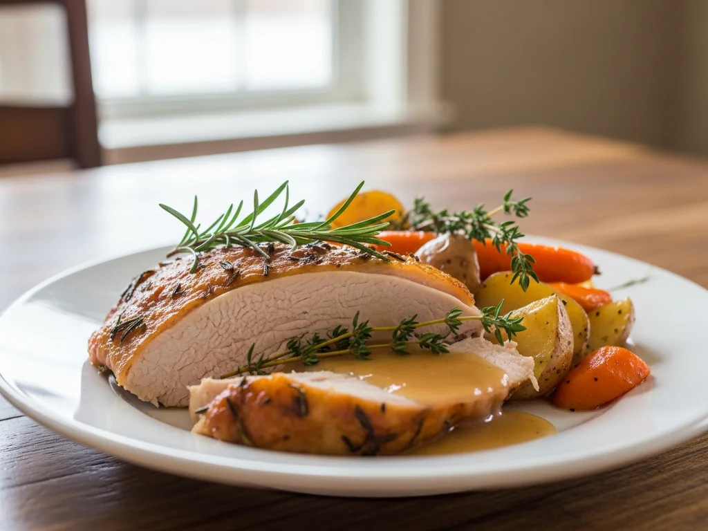 Ziołowy filet z indyka z marchewką i fasolką oraz purée z ziemniaków i batatów