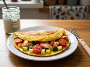 Omlet z cukinią, łososiem i pomidorkami; Ziołowy sos z sera pleśniowego