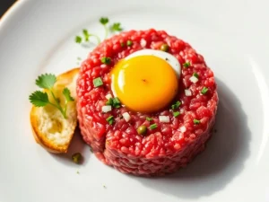 Tatar wołowy z kaparami, czerwoną cebulą, suszonymi pomidorami i aïoli