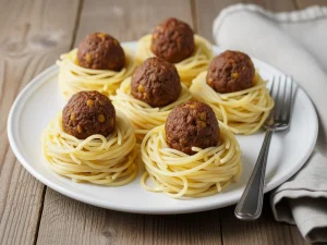 Pulpety z soczewicy z makaronem w sosie pomidorowym