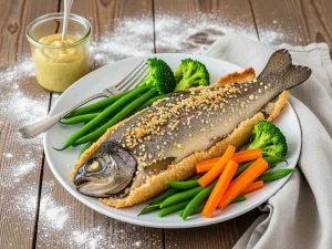 Pstrąg pieczony w soli z sosem musztardowym i warzywa na parze