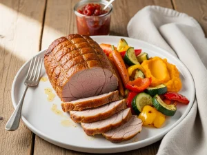 Pieczona wieprzowina z chutneyem, warzywami i purée z batatów