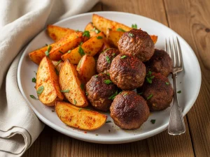 Pieczone pulpety i pikantne ziemniaki z papryką