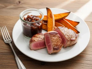 Polędwiczki wieprzowe z sosem cebulowo-winnym i pieczonymi batatami (TM5)