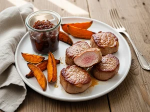 Polędwiczki wieprzowe z sosem cebulowo-winnym i pieczonymi batatami (TM6)