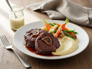 Policzki wołowe z purée z selera i warzywami w kremowym sosie