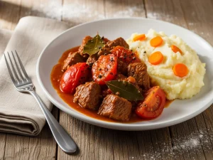 Pomidorowy gulasz wołowy z pureé ziemniaczanym z marchewką