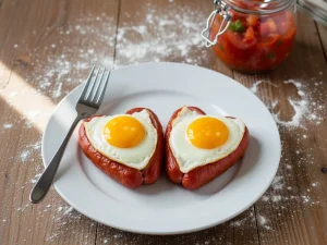 Parówki-serca z jajkiem sadzonym; Sos pomidorowo-paprykowy