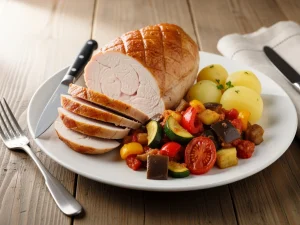Piersi z indyka (sous-vide, z osłoną noża miksującego) z ratatouille i ziemniakami